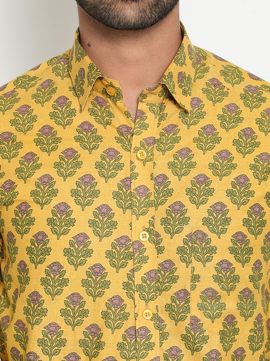 Yellow Full Sleeve Cotton Hand Block Printed Men's Shirt