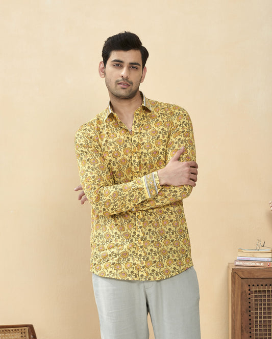 Yellow Full Sleeve Cotton Hand Block Printed Men’s Shirt