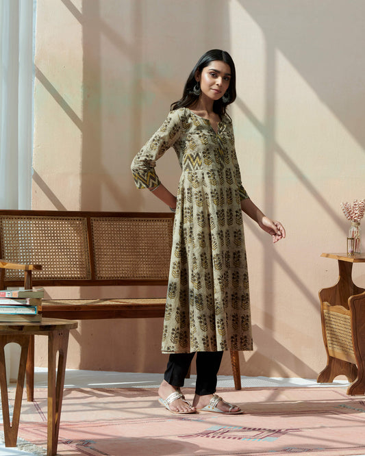 Beige Hand Block Bagru Printed Cotton Kurta Set without dupatta without Dupatta