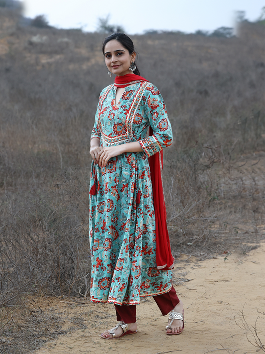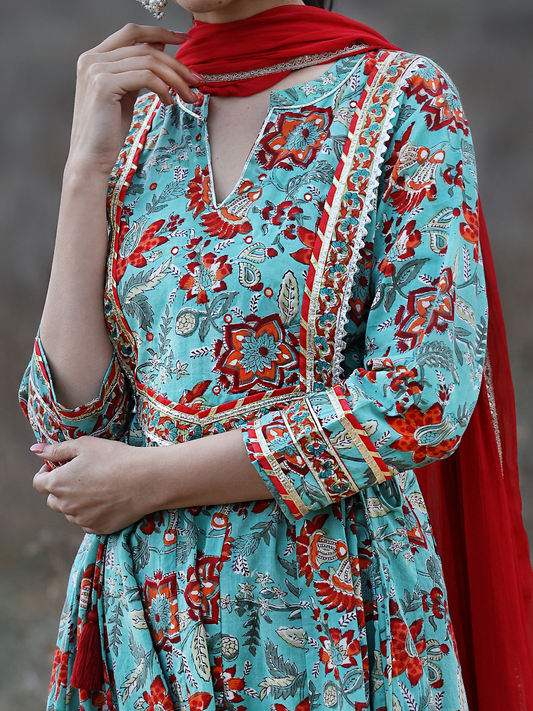 Sea Green Hand Block Cotton Printed Sea Green Anarkali Kurta Set