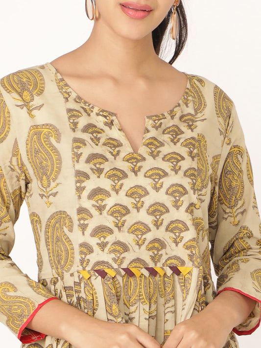 Hand Block Bagru Printed Kurta Neck Emb. With Gotta Lace