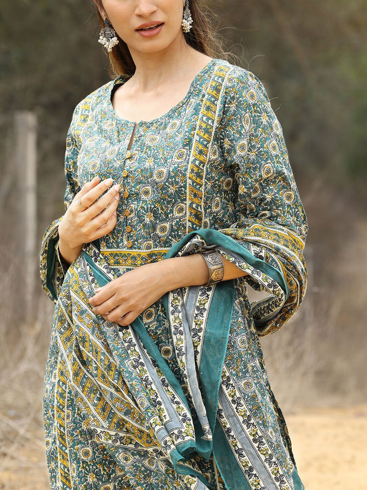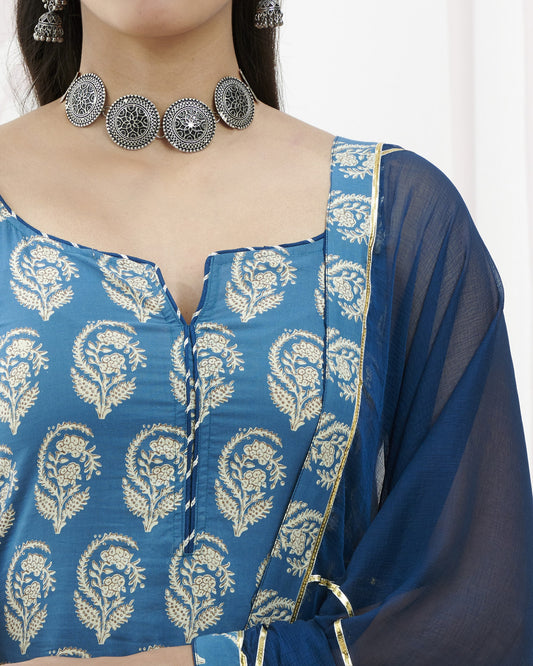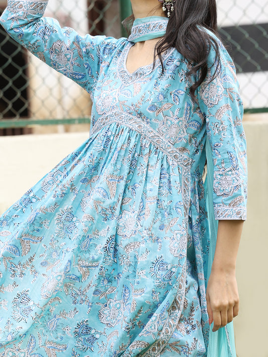 Blue Hand Block Printed Cotton A-Line Kurta Set with Plain Pant & Chiffon Dupatta