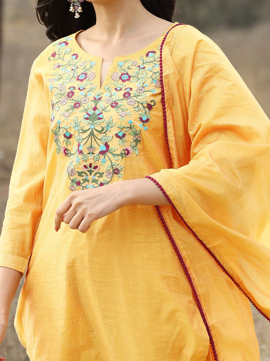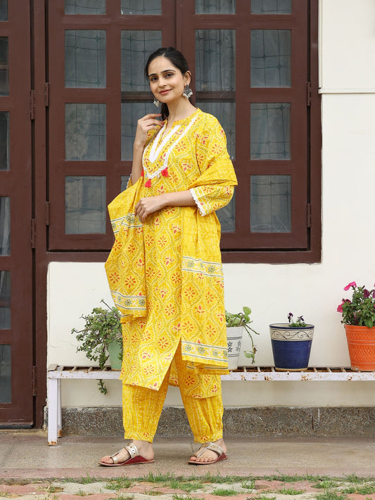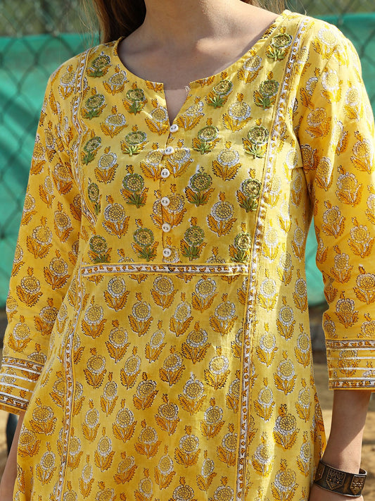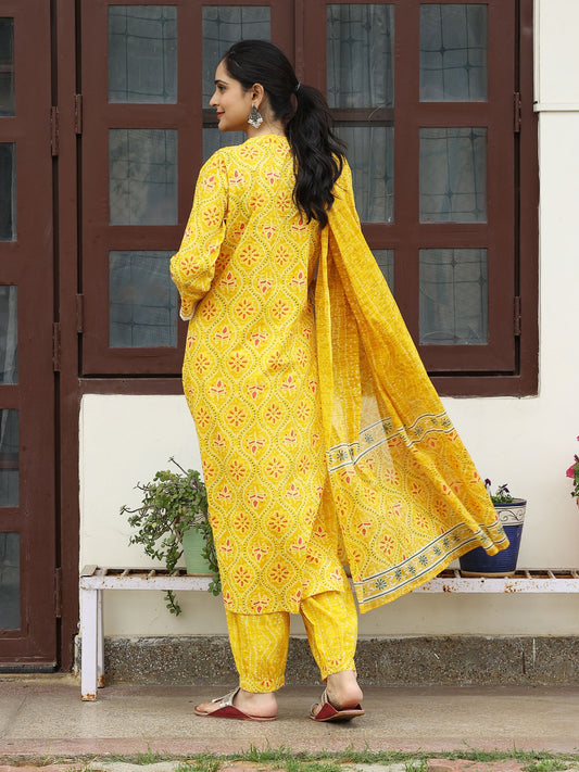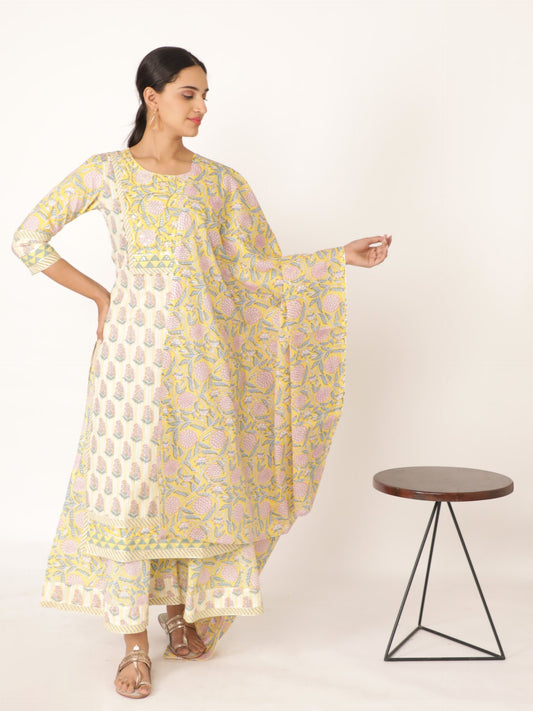 Yellow Hand Block Bagru Printed Cotton Kurta Set with Dupatta