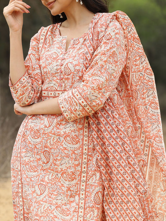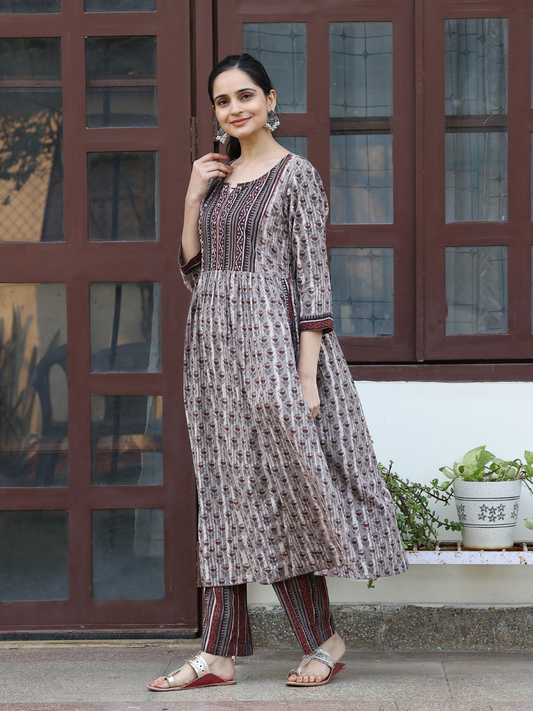 Light Brown Hand Block Cotton Printed Anarkali Kurta Set with Pant & Chiffon Dupatta