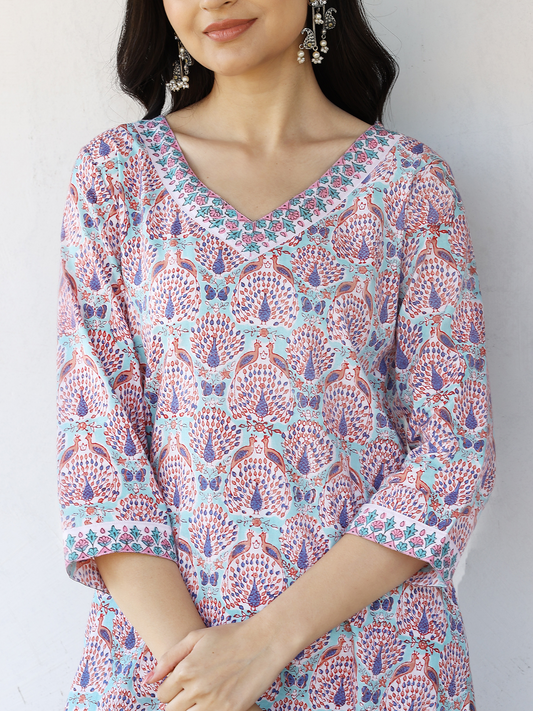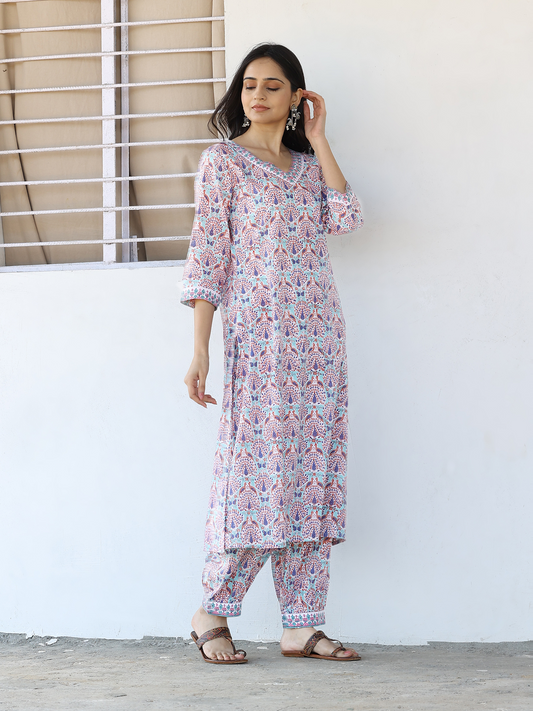 Serene Light Blue Hand Block Bagru Printed Cotton Kurta Set