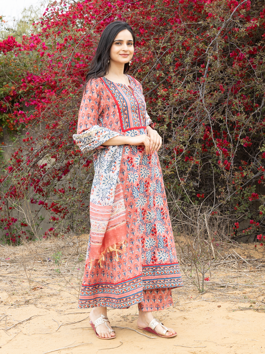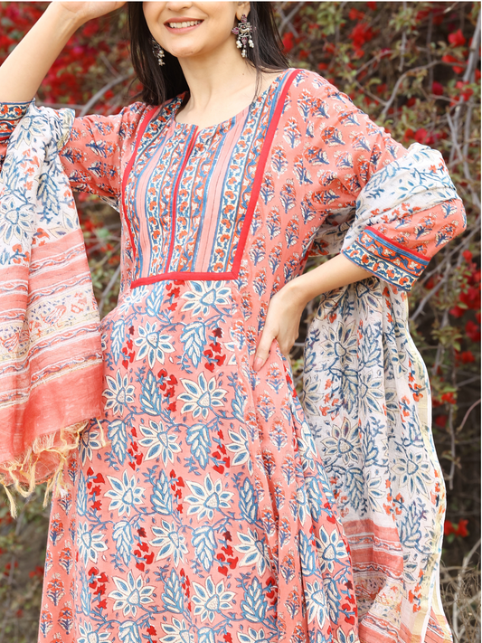Pink Hand Block Printed Cotton Anarkali Kurta Set with Printed Pant & Chanderi Dupatta