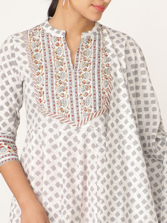 White Hand Block Bagru Printed Cotton Anarkali Kurta With Hand Emb On Yoke