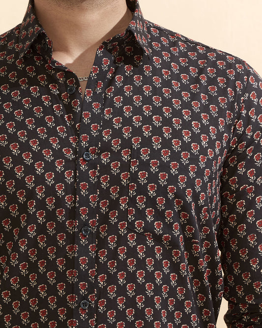 Black Full Sleeve Cotton Hand Block Printed Men's Shirt