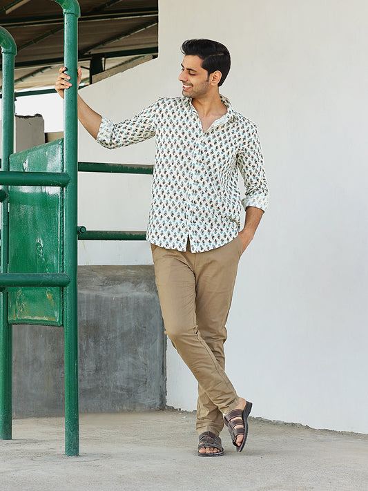 Full Sleeve Hand Block Motif Printed Mens Shirt (White)