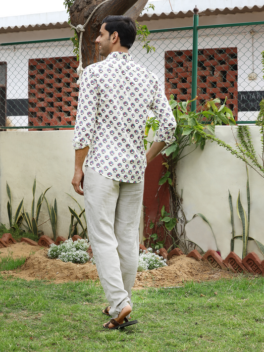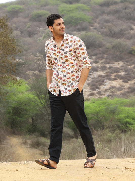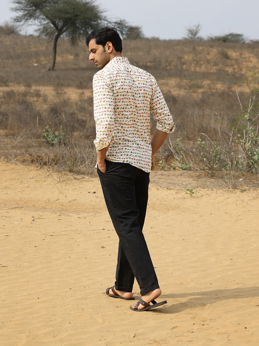 Full Sleeve Hand Block Animal Printed Mens Shirt (Off White)