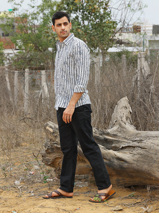 Full Sleeve White Hand Block Turban Printed Men's Cotton Shirt