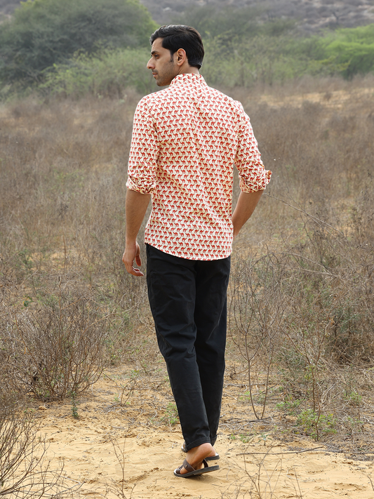 Full Sleeve Hand Block Camel Printed Mens Cotton Shirt (Red)