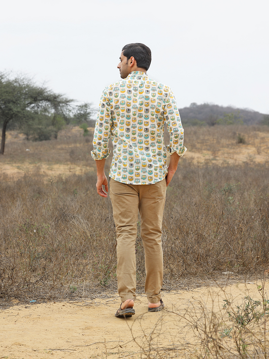 Full Sleeve Hand Block Owl Printed Mens Cotton Shirt (White)