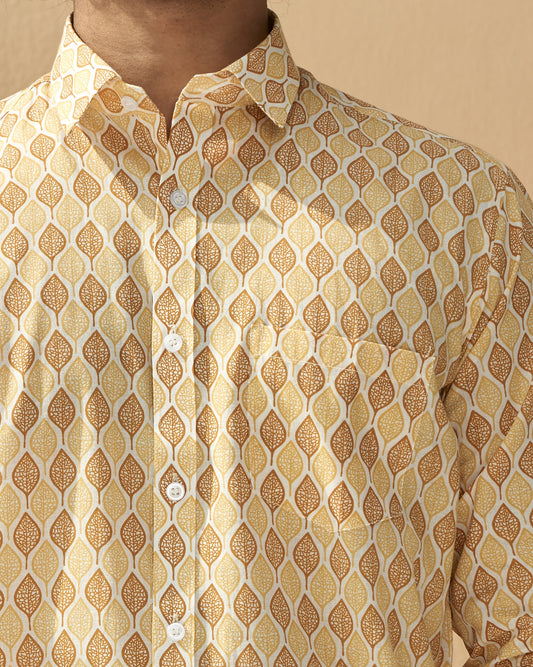 Mustered Yellow Full Sleeve Cotton Hand Block Printed Men’s Shirt