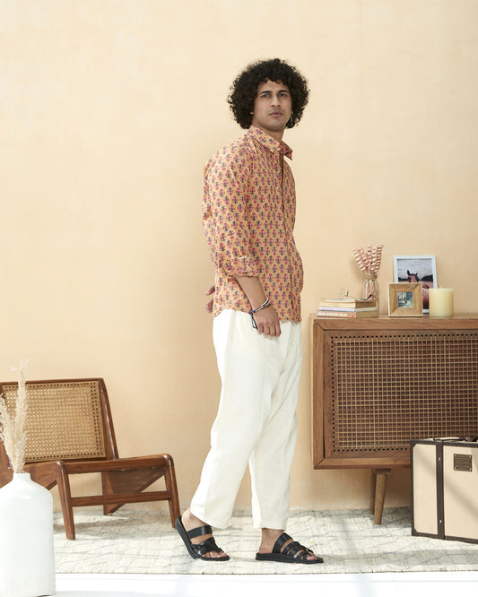 Peach Full Sleeve Cotton Hand Block Printed Men's Shirt