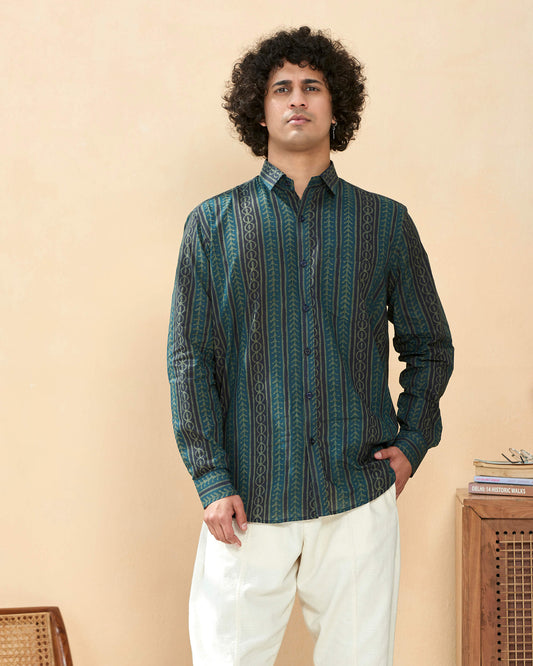 Moongia Green Full Sleeve Cotton Hand Block Printed Men’s Shirt