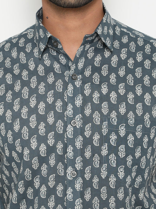 Grey Short Sleeve Cotton Hand Block Printed Menās Shirt