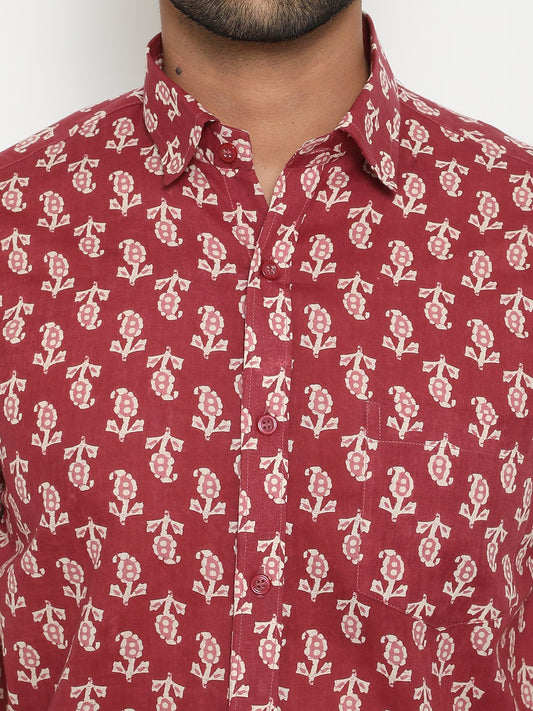 Red Short Sleeve Cotton Hand Block Printed Menās Shirt