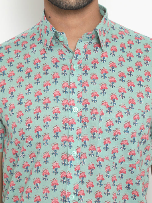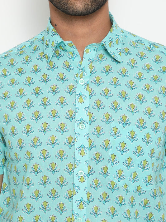 Aqua blue Short Sleeve Cotton Slim Hand Block Printed Menās Shirt