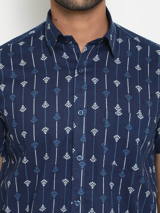 Blue Cotton Hand Block Printed Short Sleeve Shirt