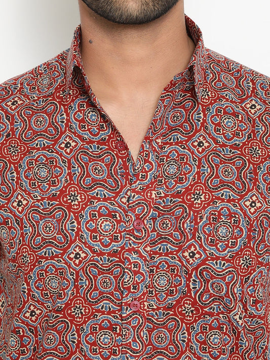Red Full Sleeve Cotton Hand Block Printed Men's Shirt