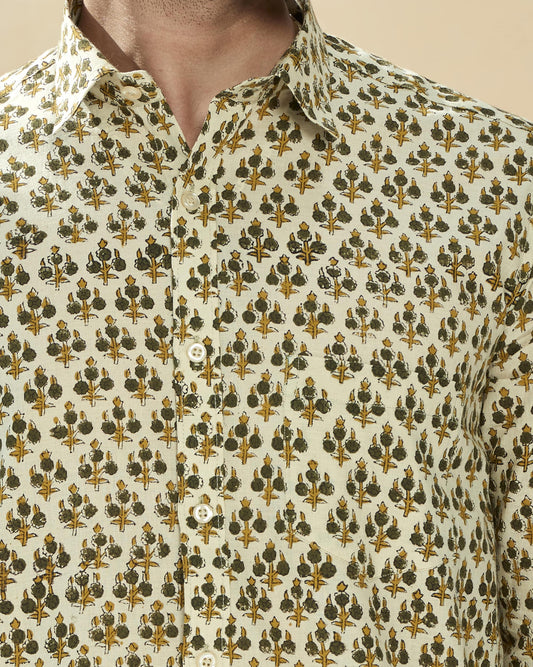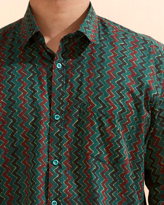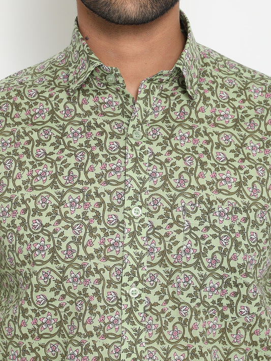 Green Cotton Hand Block Printed Men's Shirt
