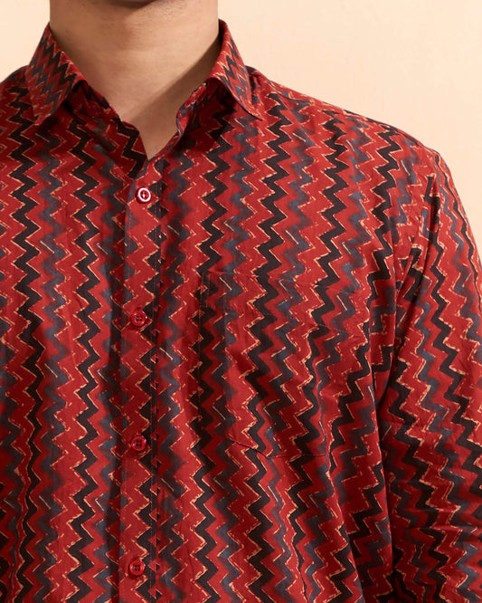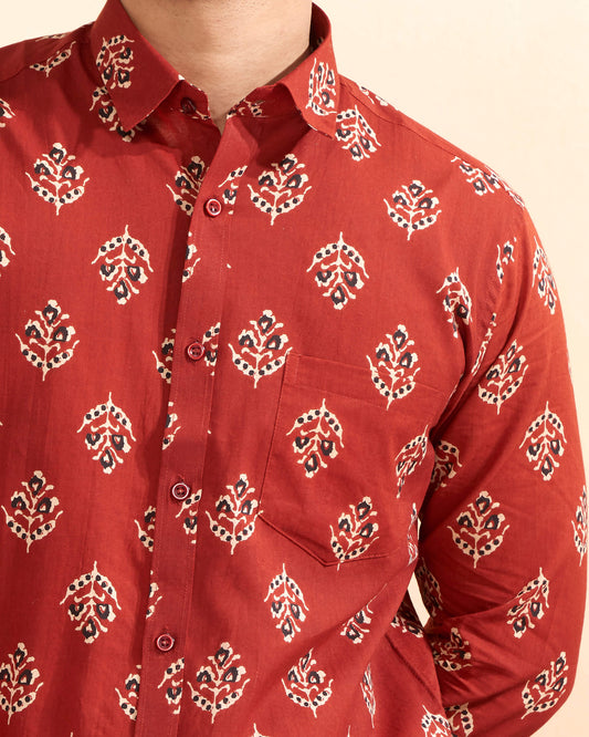 Full Sleeves Red Crepe Cotton Hand Block Printed Casual Men's Shirt