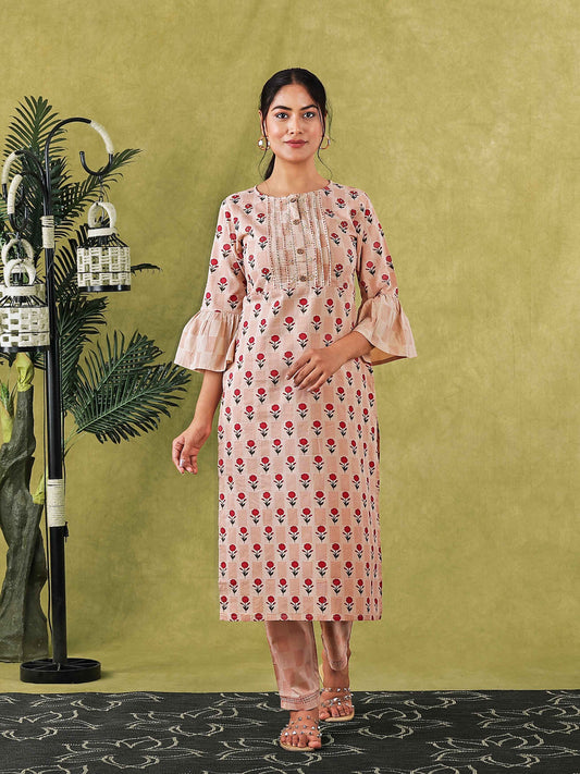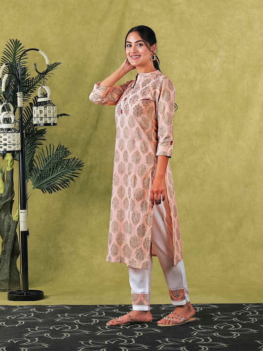 Peach Gold Printed Women Kurta Set with Embroidery at Yoke