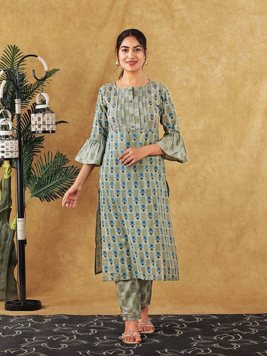 Green Floral Printed Flared Sleeve Women Kurta Set with Embroidery at Yoke