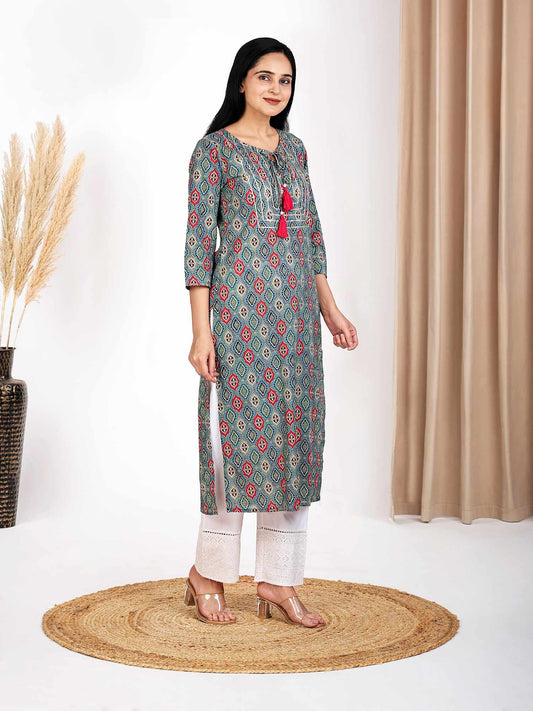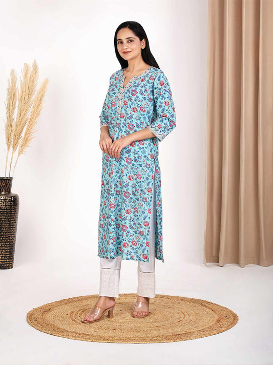 Blue Geometric Printed Straight Kurta with Gotta Work at Neck