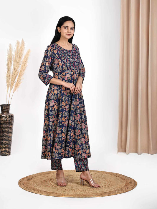 Navy Floral Print Anarkali Kurta Set with Thread Embroidery at Yoke