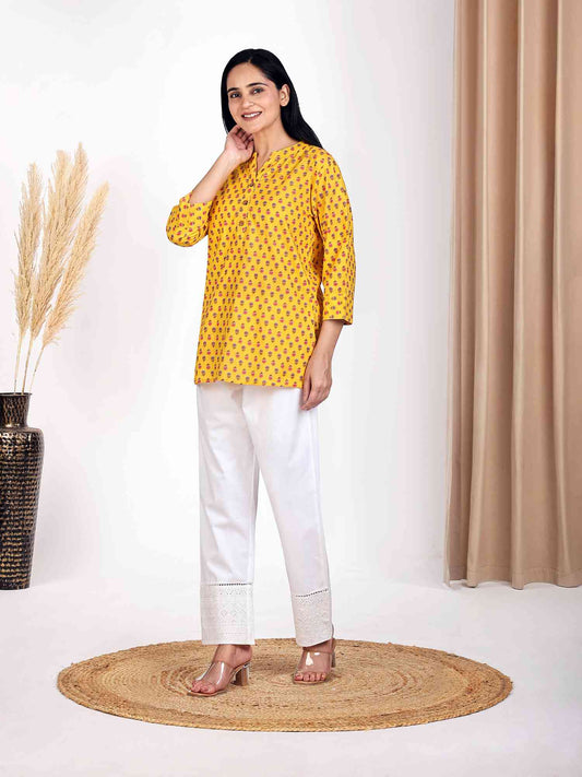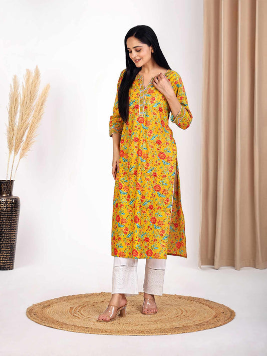 Yellow Round V-Neck Floral Printed Straight Kurta for Women