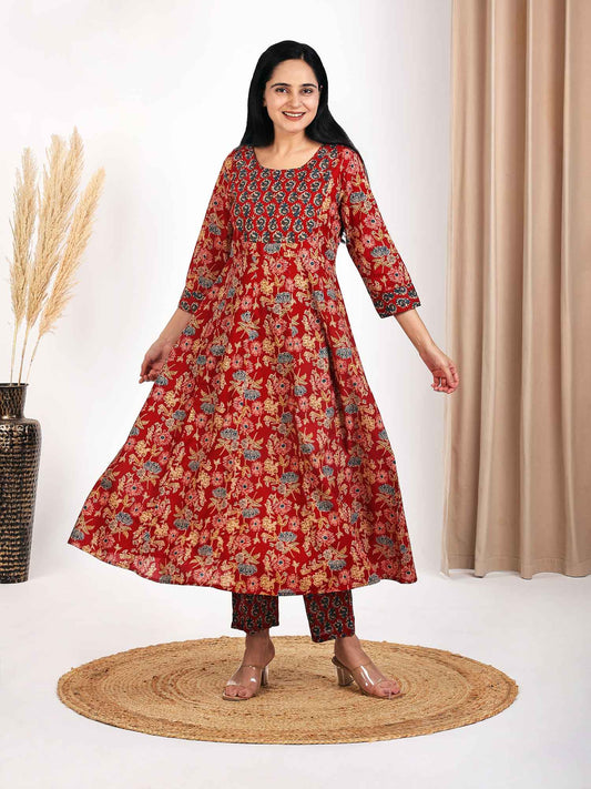 Red Floral Print Anarkali Kurta Set with Embroidery at Yoke