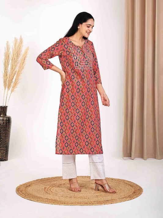 Peach Geomatric Printed Straight Kurta for Women With Gotta Work At Neck