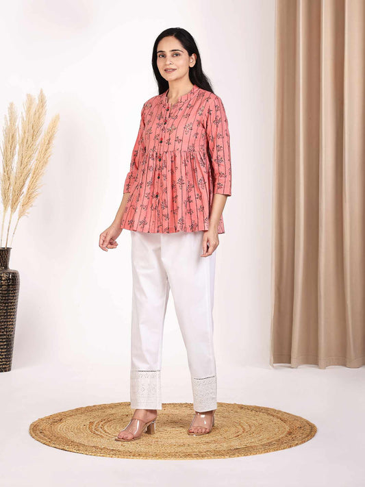 Women's Pink Floral Printed Peplum Top with Embroidery at Yoke Pure Cotton