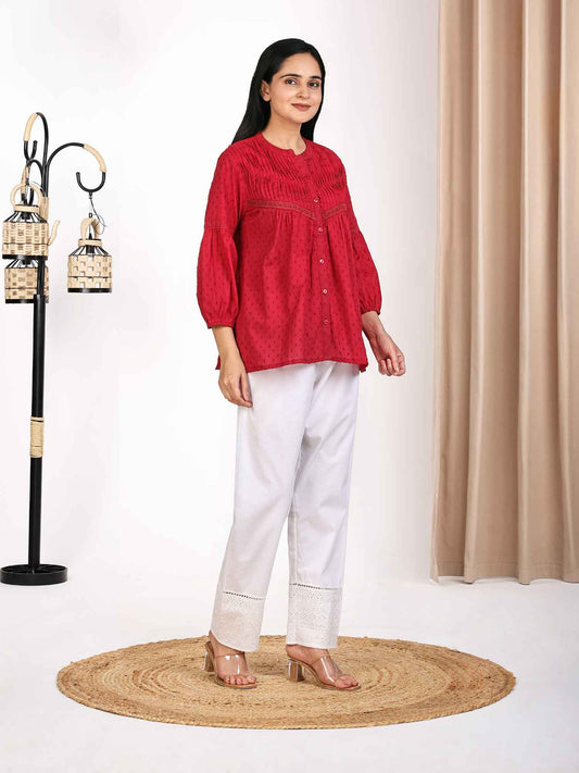 Red Solid Dobby Structured Pure Cotton Peplum Top For Women