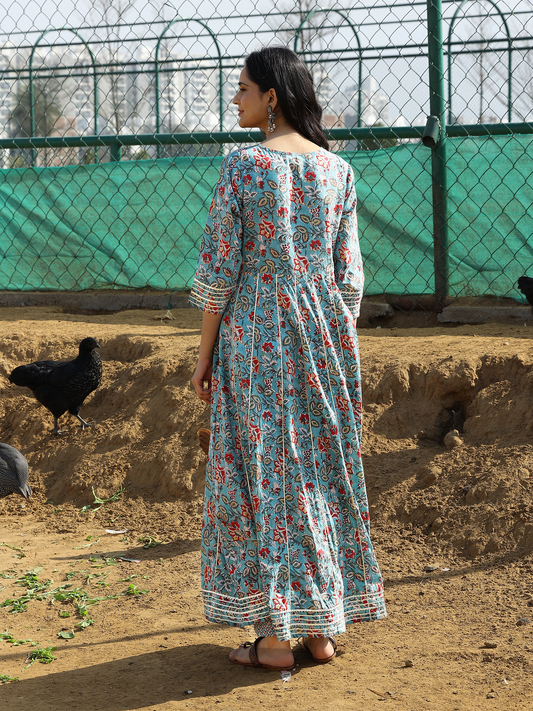 Light Blue Hand Block Cotton Printed Anarkali Kurta Set with Beads & Gotta Work with Chiffon dupatta