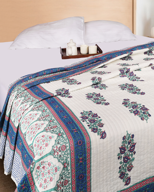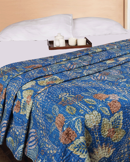 Blue Hand blocked Printed Reversible Double Bed Quilt