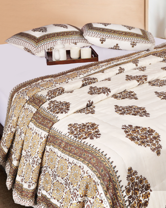 Light Brown Hand Block Printed Reversible Single Quilt Set | Set of 2 PCS
