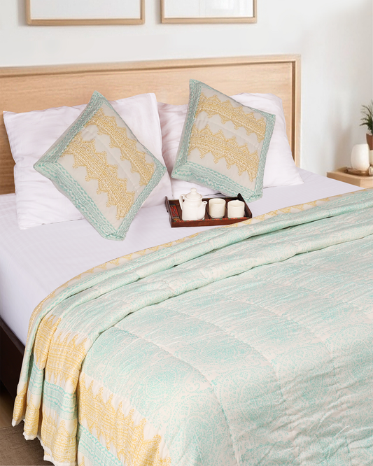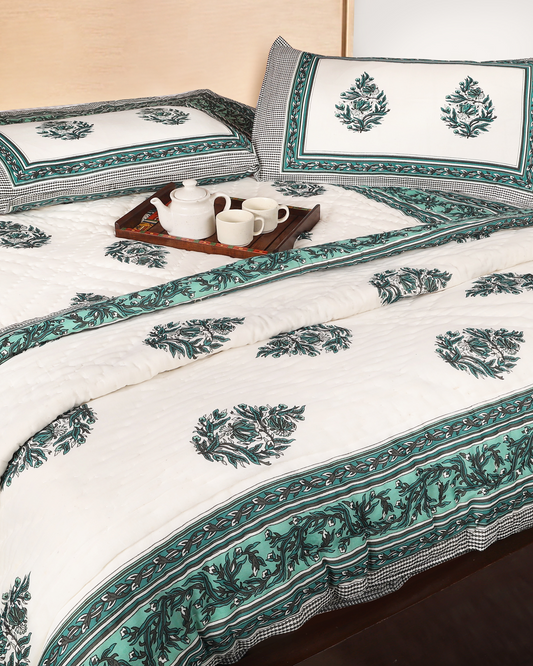 Light Green Hand Block Printed Reversible Double Bed Quilt Set