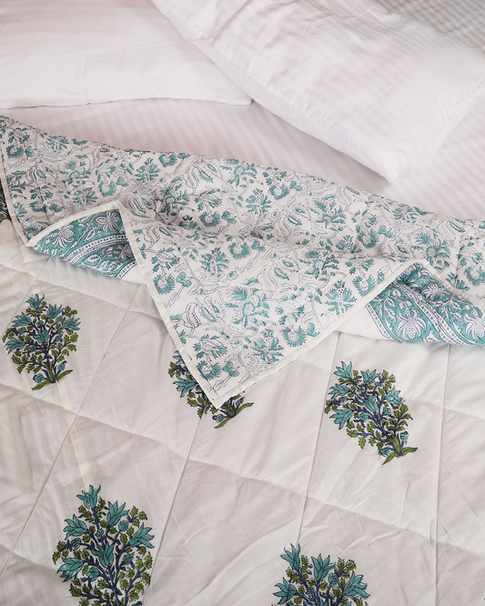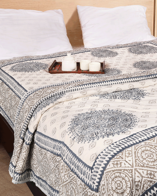 White Hand Blocked Printed Reversible Double Bed Quilt
