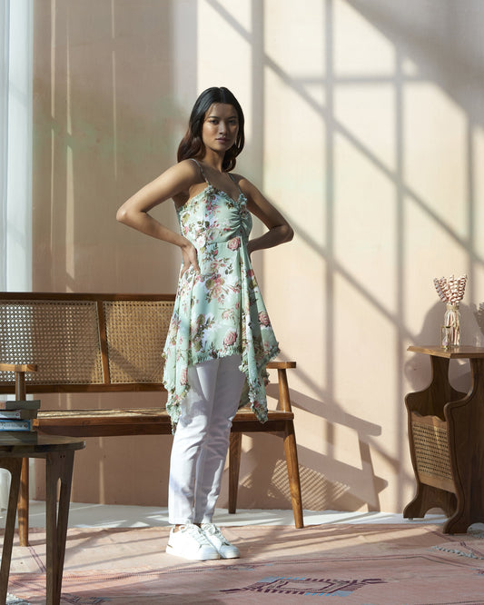 Floral Printed Strappy Top With High Low Hem