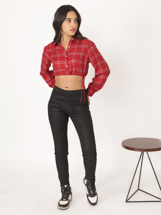 -50% OFFRed Cotton Checks Full Sleeve Top