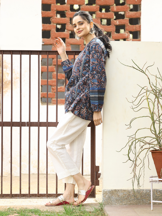 Blue Hand Block Dabu Printed Round Neck Cotton Top