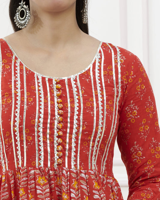 Red Cotton Hand Block Bagru Printed Tiered Dress With Gotta Lace