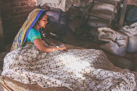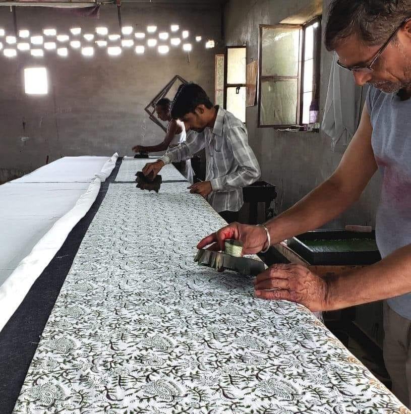 We work both in Bagru and Sanganer. In Sanganer, we work at our facility using AZO-free, eco-friendly, pigment colors with our own print designs. The advantage of 'modern' synthetic dyes is that they are colorfast, easier to produce, and machine washable. In Bagru, we work with a local printer using vegetable dye and dabu mud resist techniques in traditional prints such as indigo prints.