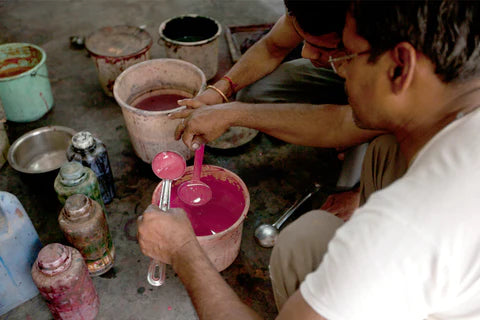 The traditional craft of hand block printing on textiles, using rich natural colors, has been practiced in Rajasthan for over 500 years. This technique was introduced to the Jaipur region by the Chhipa community, who originally hailed from Bagru Village, renowned today for its vegetable dye and mud resist (Dabu) block prints. Block printing has been passed down from generation to generation and then the locality passed it through places, such as Sanganer, close to Jaipur. And more recently, in the traditional Bagru style, every family creates its own secret 'recipes' for plant-based dyes, lovingly kept and then passed on from generation to generation. The quality of colors solely relies on many factors, including the plant, the water, and expertise of the printing master. However, more modern forms of block printing, like that in Sanganer, make use of AZO-free pigments mixed with binders.