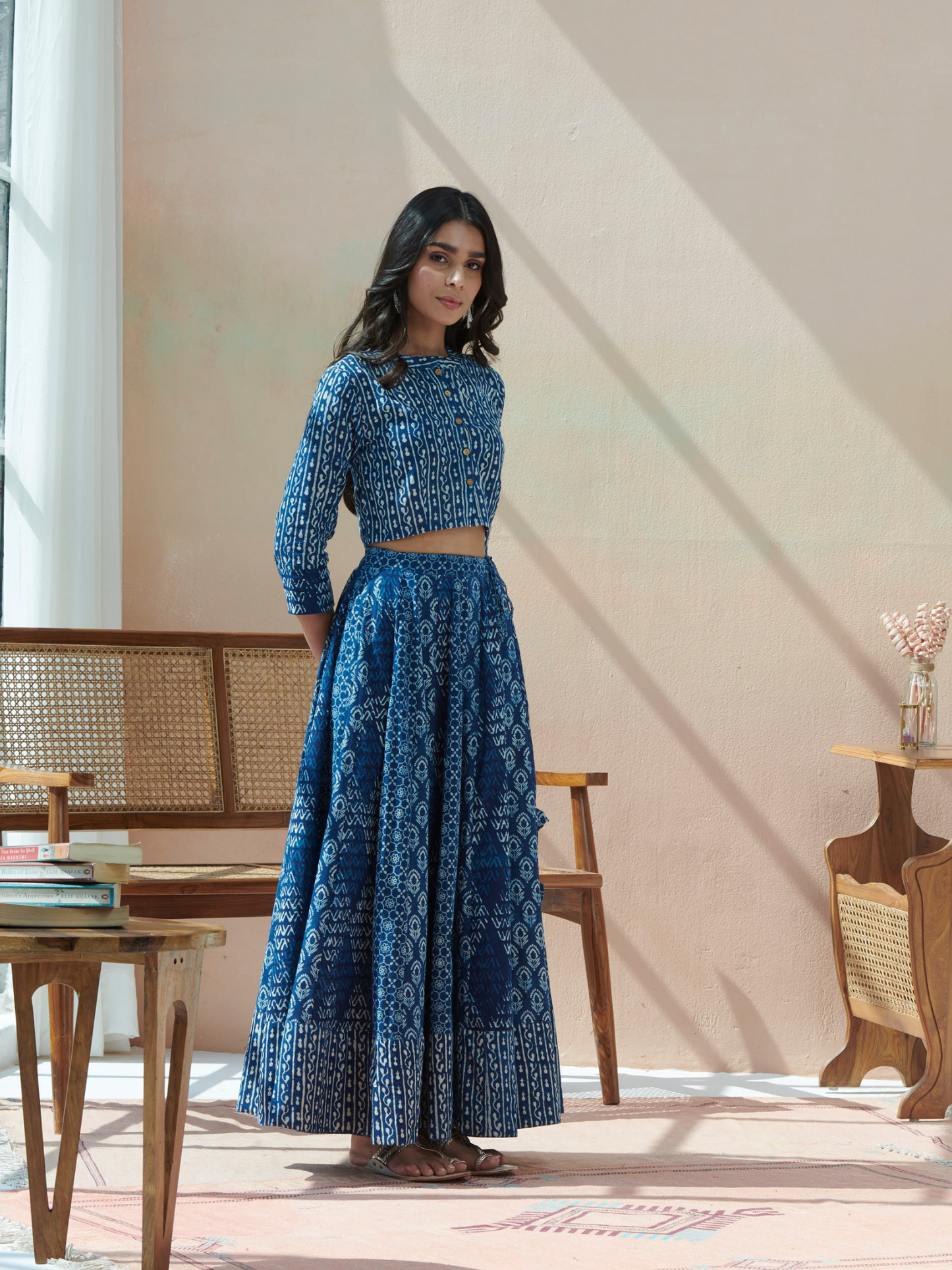 Elevate your wardrobe with our Indigo Hand Block Print Skirt Top Set, crafted from 100% cotton. This set features a stunning indigo hand block print design, embodying traditional artistry and modern elegance. Perfect for versatile styling, it offers comfort and sophistication for any occasion.