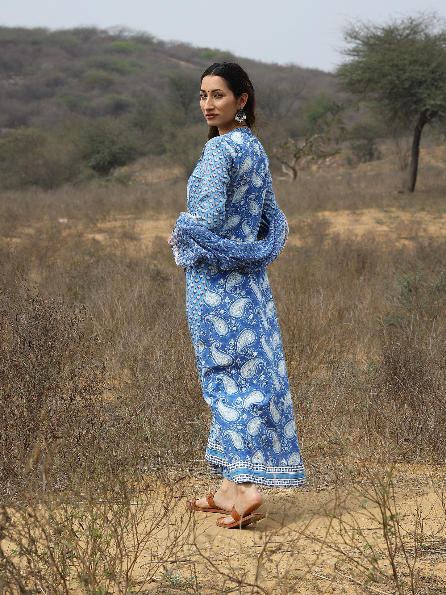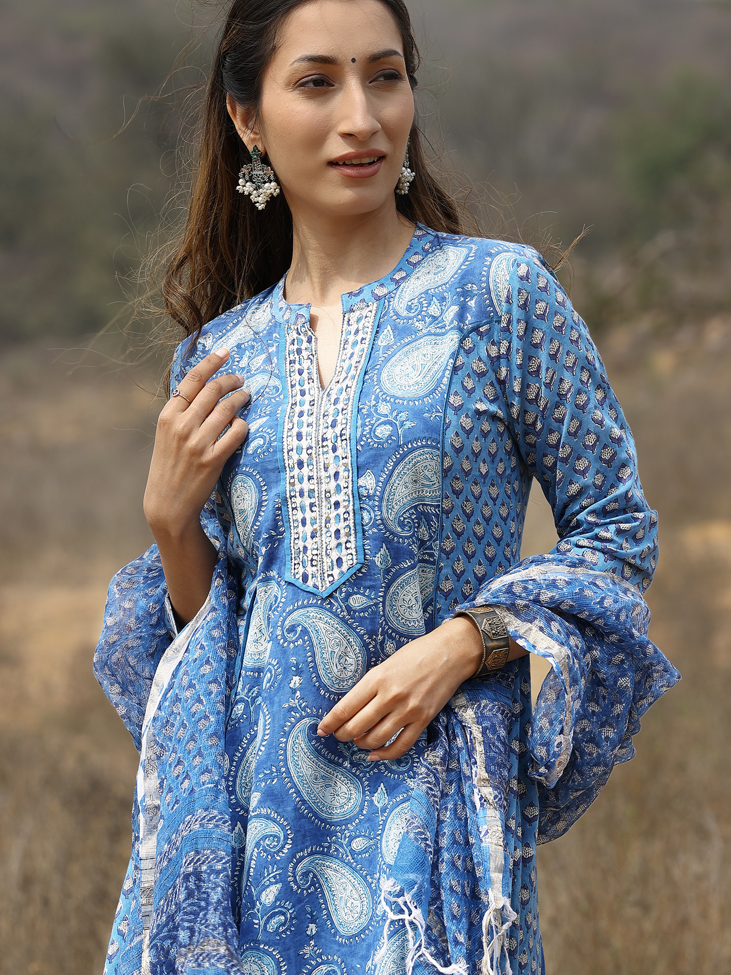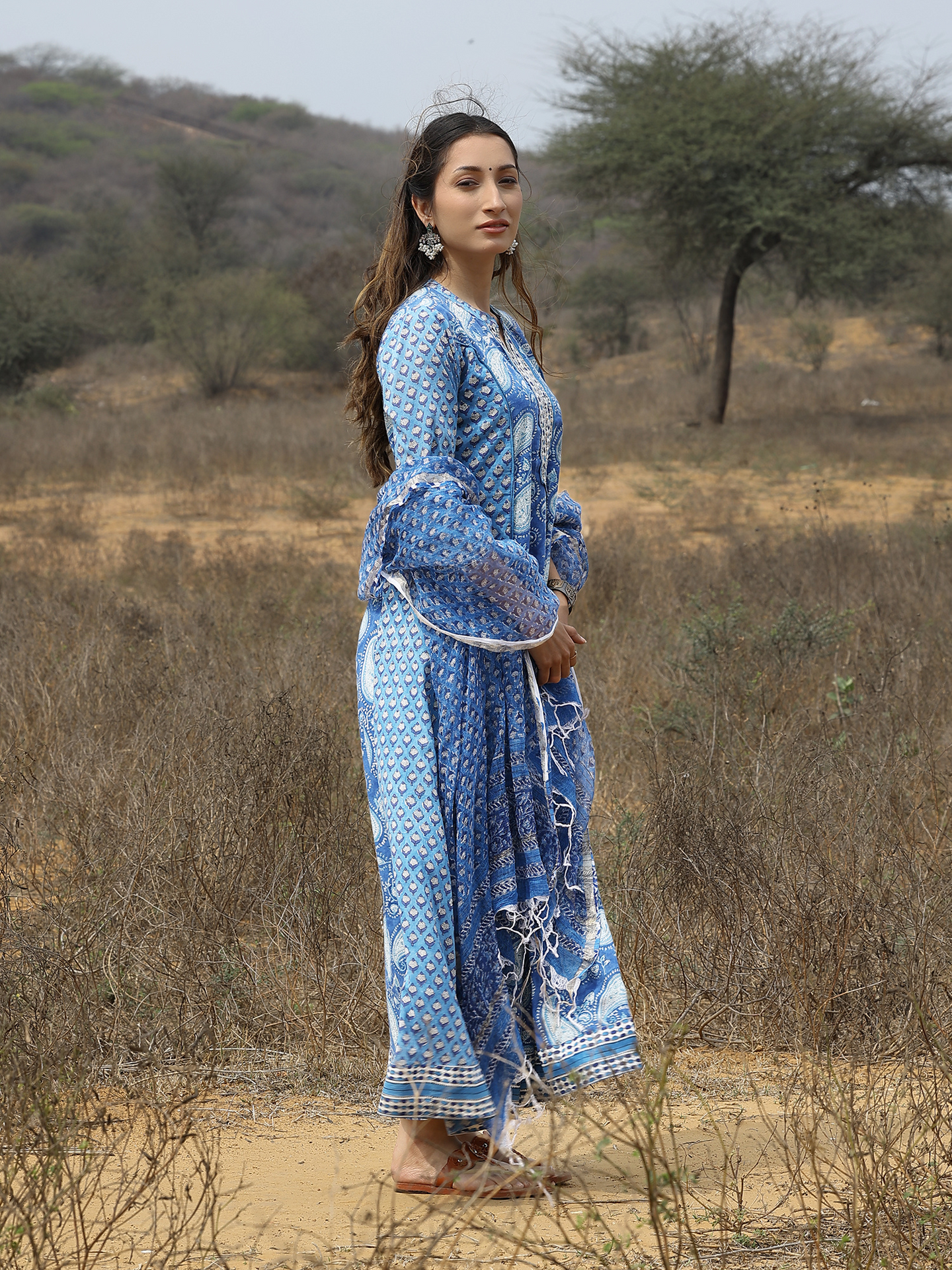 Blue Cotton Hand Block Printed Anarkali Kurta Set with Sequin Work & Kota Doriya Dupatta