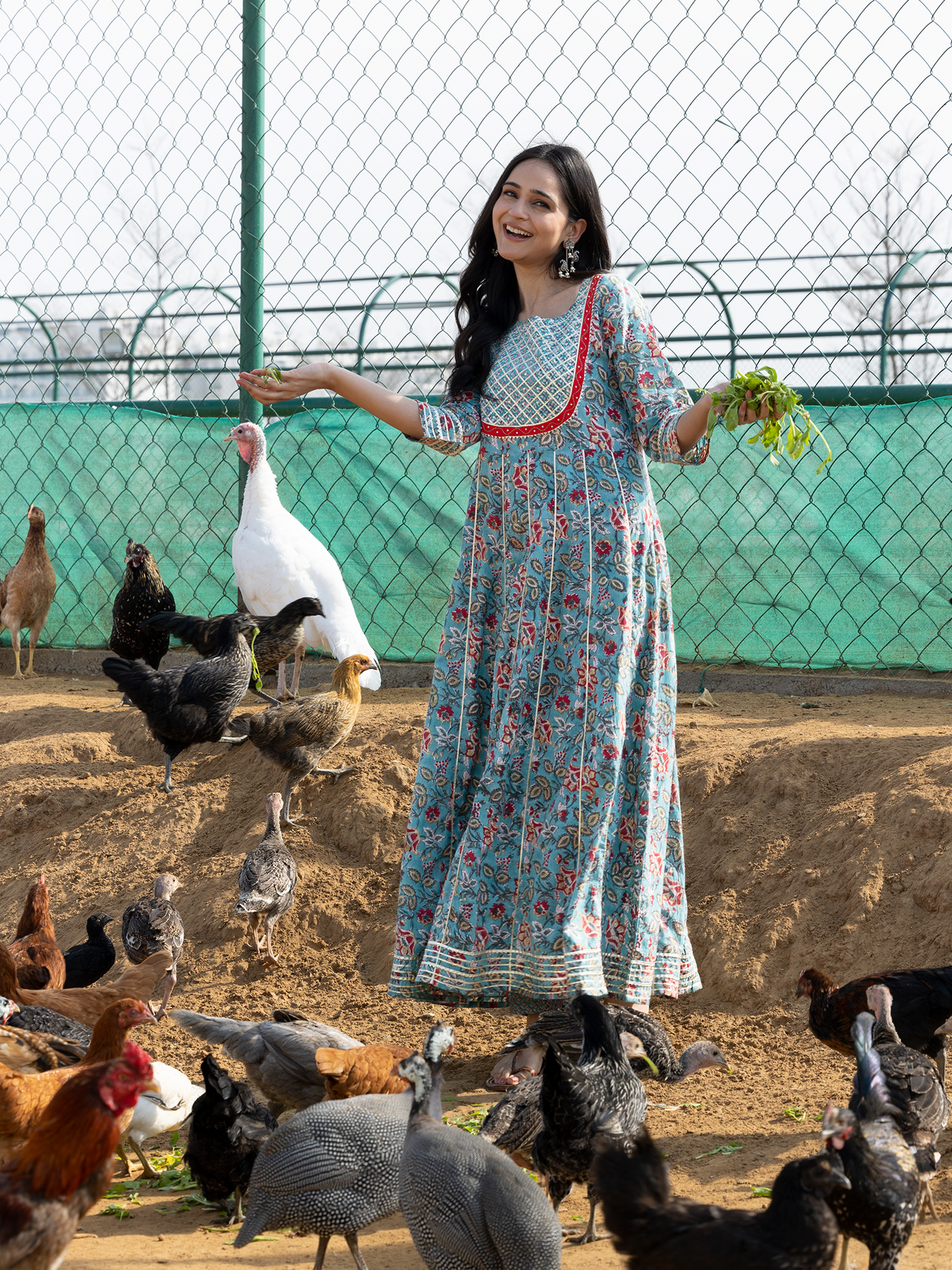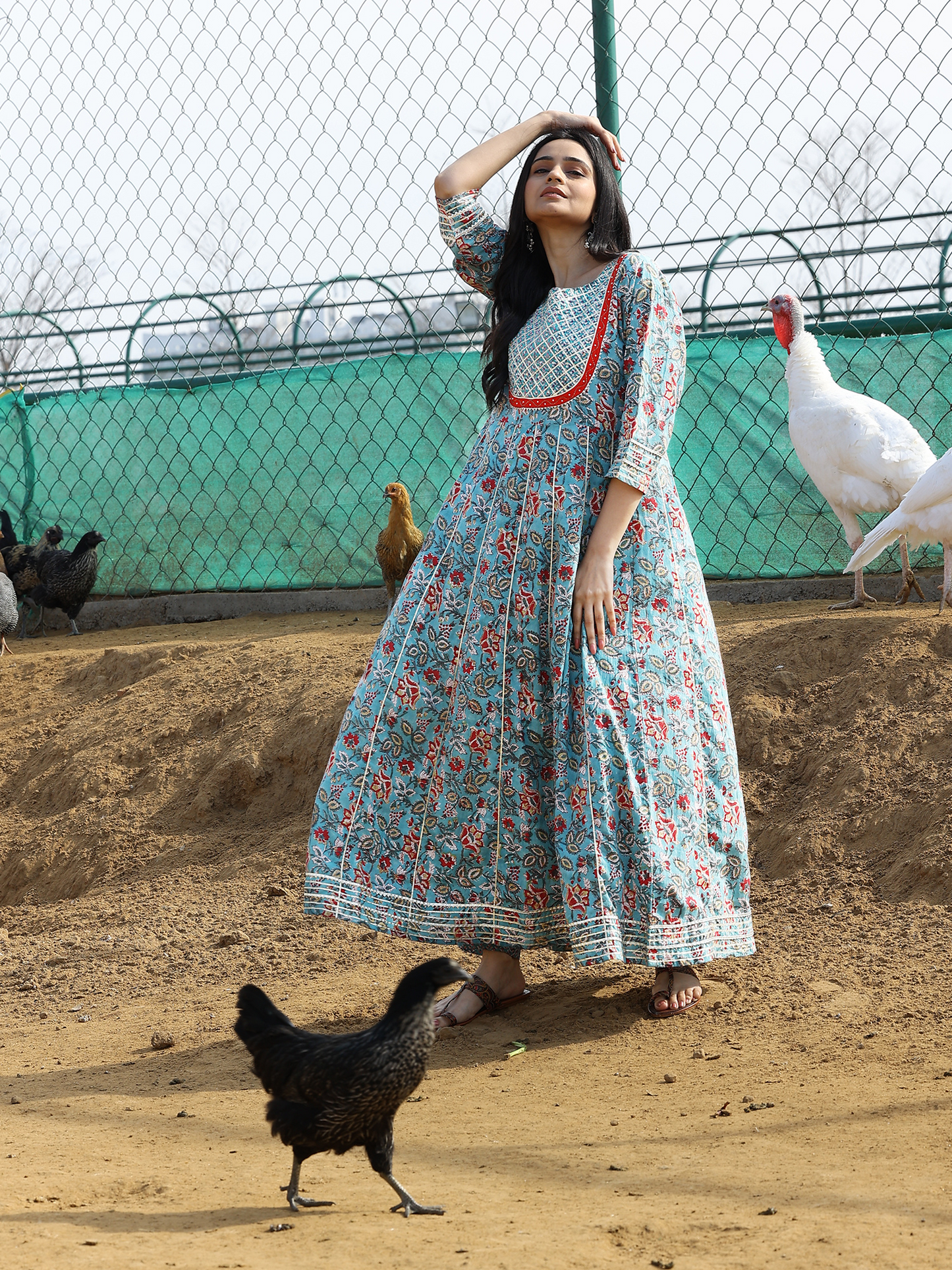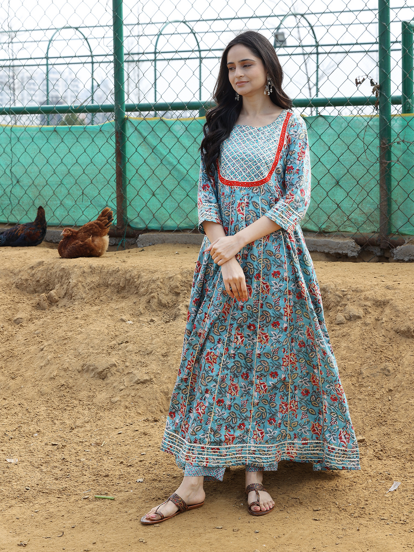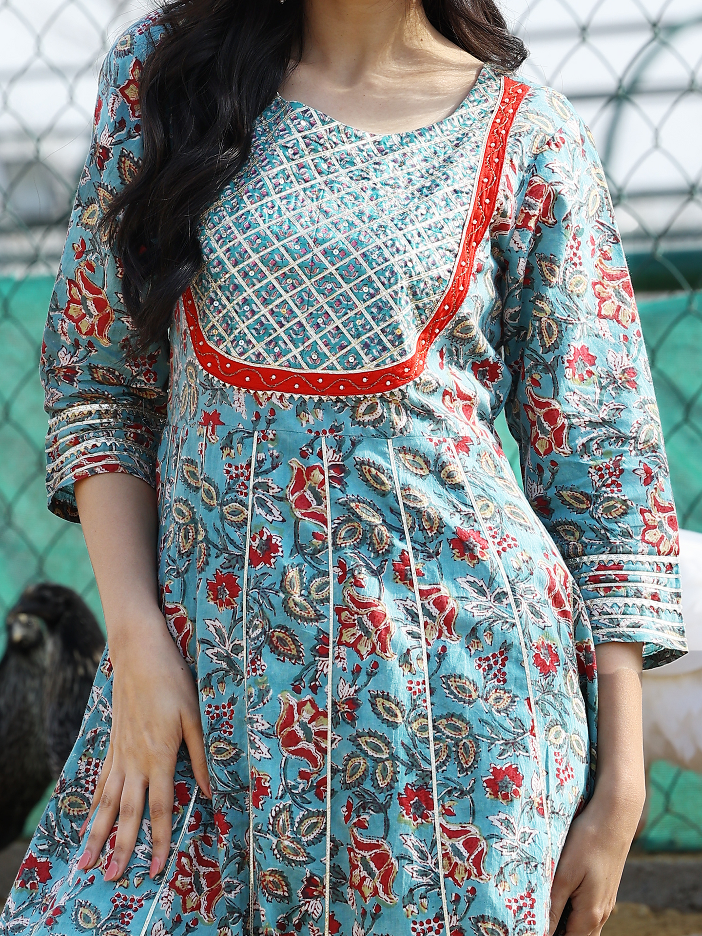 Light Blue Hand Block Cotton Printed Anarkali Kurta Set with Beads & Gotta Work with Chiffon dupatta